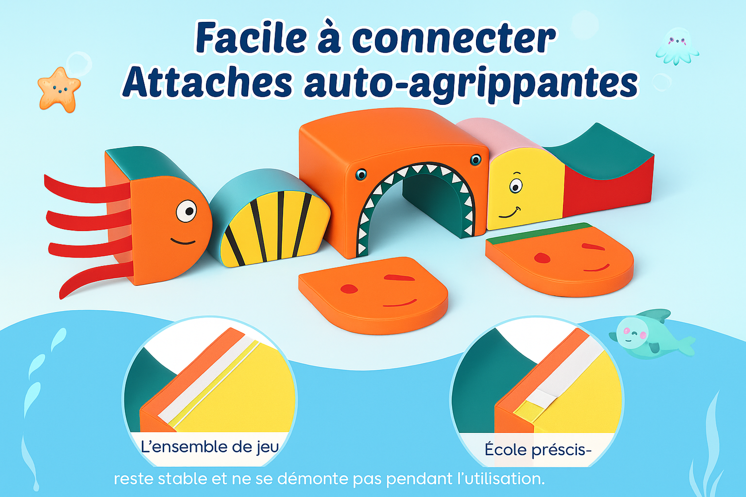 Grâce à ses attaches auto-agrippantes robustes, le parcours reste parfaitement stable, sans risque de glisser ou de se démonter. Les enfants peuvent jouer, ramper et grimper en toute sécurité, à la maison comme en collectivité.